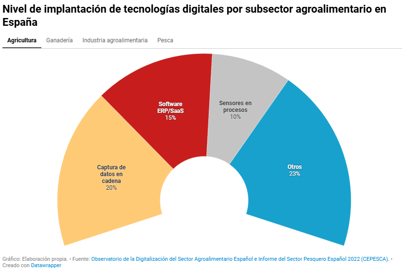 La pesca tiene un marcado carácter artesanal en España y, por tanto, presenta una baja implantación tecnológica. Aunque también es cierto que existen iniciativas de pesca inteligente con sensores y sistemas de geolocalización, pese a contar con una implantación aún marginal. Así, tan solo el 22 % de las embarcaciones utiliza geolocalización, y apenas el 18 % emplea software de gestión de capturas, tal y como refleja el Informe del Sector Pesquero Español 2022 (CEPESCA).