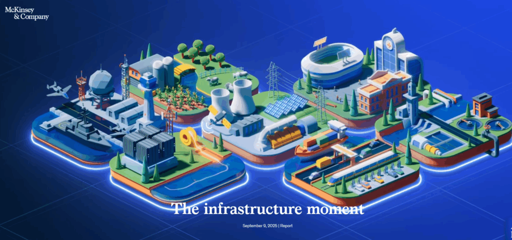 McKinsey estima que se necesitará una inversión acumulada de 106 billones de dólares hasta 2040 para satisfacer la necesidad de infraestructura nueva y actualizada. La inversión requerida abarca siete verticales de infraestructura crítica, siendo el transporte y la logística los que requieren la mayor parte (36 billones de dólares), seguidos de la energía y la electricidad (23 billones de dólares), el sector digital (19 billones de dólares), el sector social (16 billones de dólares), la infraestructura de residuos y agua (6 billones de dólares), la agricultura (5 billones de dólares) y la defensa (2 billones de dólares).1