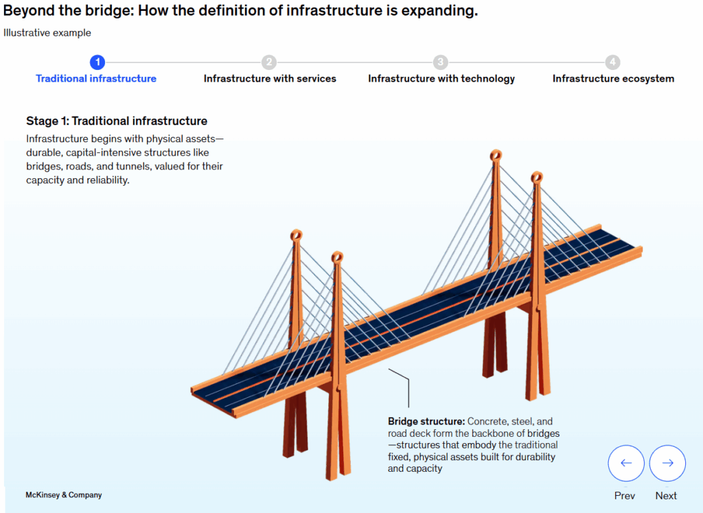 Sin embargo, la infraestructura ahora incluye elementos que habilitan nuevos activos, servicios y tecnologías, como la inteligencia artificial, las energías renovables y los vehículos eléctricos. En muchos casos, estos nuevos elementos de infraestructura se integran con los ya existentes. Por ejemplo, las redes de fibra óptica, las estaciones de carga para vehículos eléctricos y los sistemas de mantenimiento predictivo basados en IA e Internet de las Cosas (IdC) ahora funcionan en conjunto con las estructuras tradicionales de hormigón y acero.