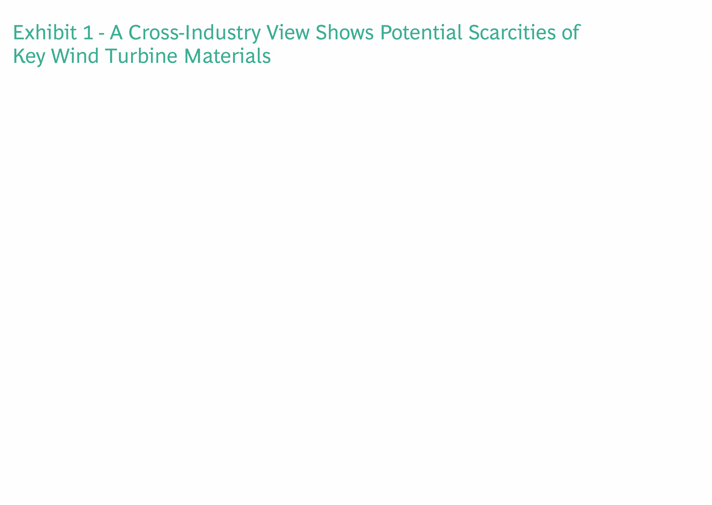 Al menos 13 materiales clave utilizados en la fabricación de turbinas eólicas, incluidos fibra de carbono, cobre, cobalto, neodimio, disprosio, praseodimio y terbio, enfrentarán escasez para 2030 según el análisis intersectorial. Si bien la posible escasez de algunos de estos materiales (en particular, las tierras raras) es bien reconocida y ha sido identificada como un posible obstáculo al ritmo de la transición energética, la posible dinámica de suministro de otros materiales es menos conocida.
