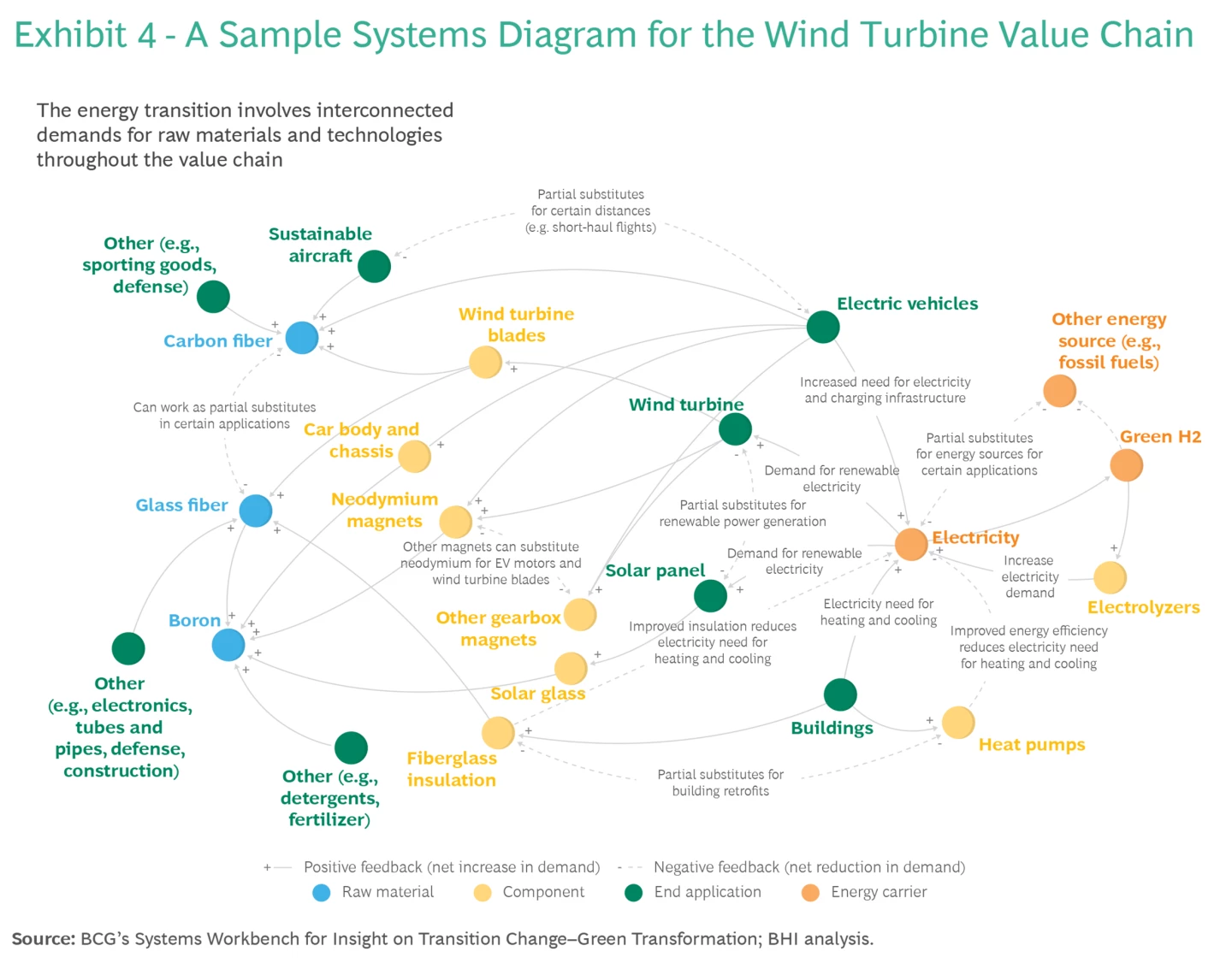 Este mapa de sistemas ayuda a identificar las relaciones que el OEM de turbinas eólicas en nuestro ejemplo debería explorar, incluidas qué acciones podrían potencialmente prevenir una escasez de suministro de fibra de carbono y las ramificaciones que estas acciones tendrían para materiales estrechamente relacionados como la fibra de vidrio y el boro.