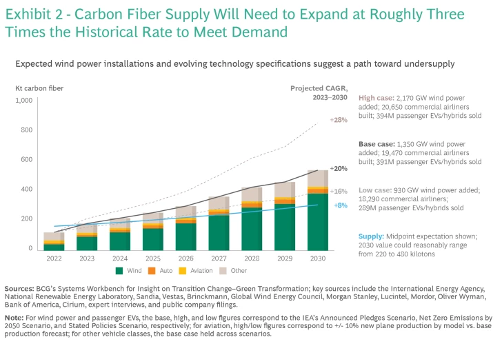 Según nuestro caso base, se espera que la demanda de fibra de carbono crezca a una tasa anual compuesta de alrededor del 20% hasta 2030 (consulte la barra lateral “Supuestos en nuestro caso base”). Esto creará una brecha considerable entre la oferta y la demanda, incluso considerando ampliaciones de producción en curso o planificadas hasta la fecha. De hecho, satisfacer la demanda proyectada de fibra de carbono en nuestro caso base requeriría desarrollar nueva capacidad a aproximadamente tres veces la tasa histórica. (Ver Anexo 2.)