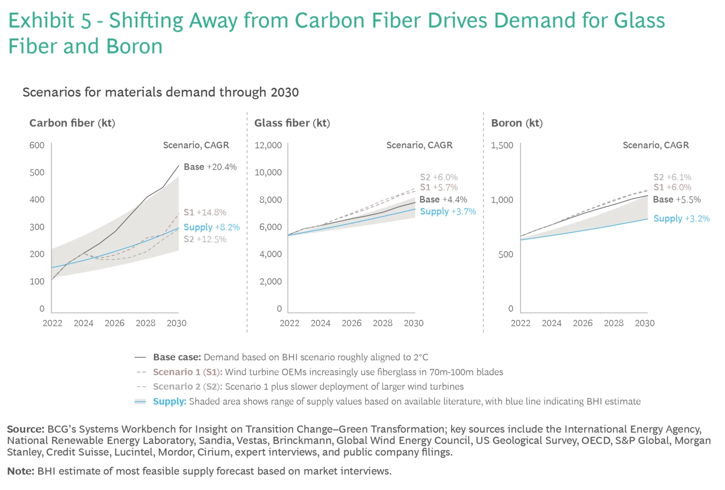 En el Cuadro 5, mostramos cómo se desarrolla cada escenario para la fibra de carbono, la fibra de vidrio y el boro. La línea azul muestra el suministro del caso base para cada material, y el área sombreada indica un rango razonable en el lado alto y bajo.