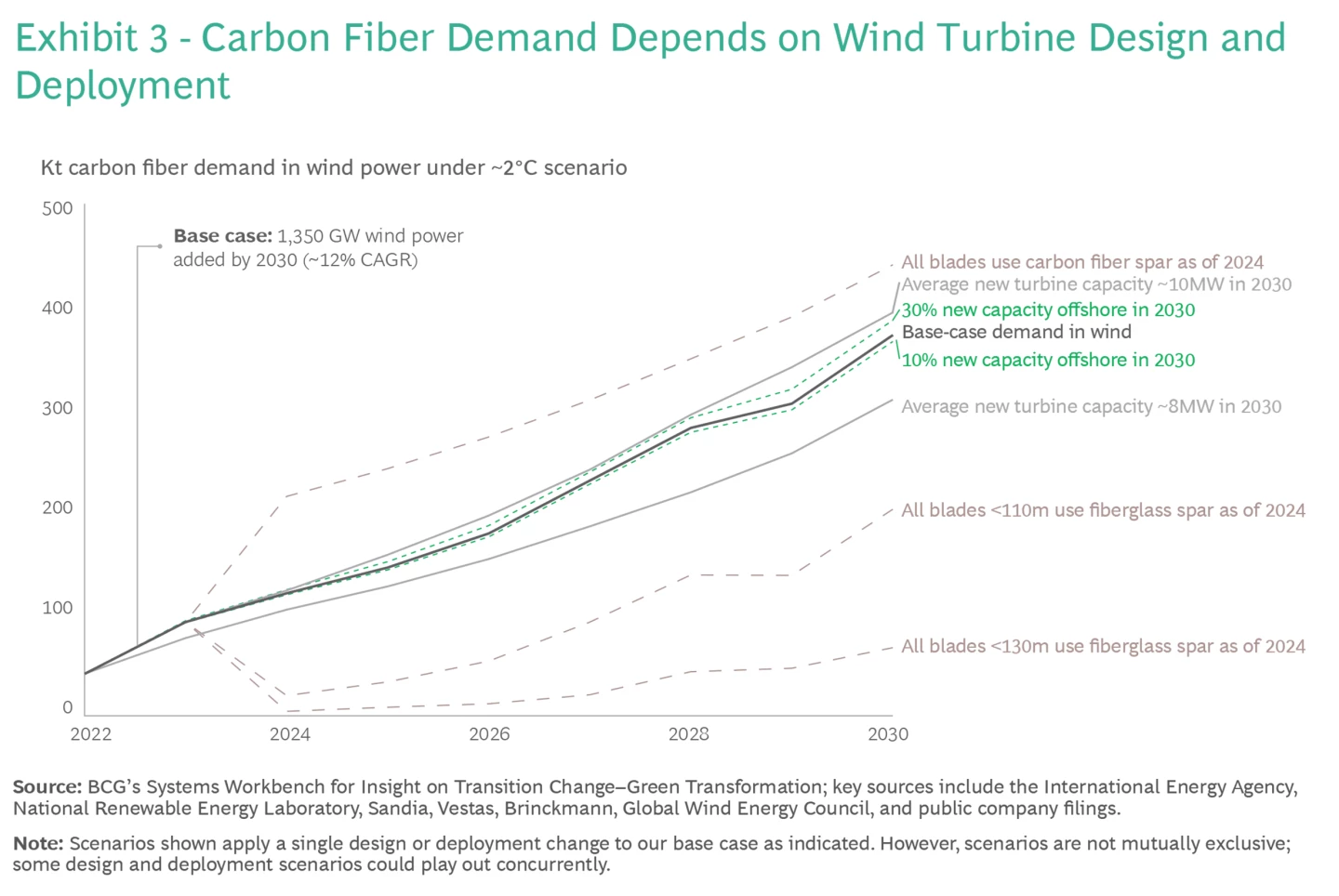Ante una posible escasez de fibra de carbono, los fabricantes de equipos originales de energía eólica probablemente buscarán formas de limitar futuras interrupciones en la cadena de suministro. Esto puede incluir cambiar la composición de las palas o retrasar el despliegue de turbinas más grandes. Si estas opciones se adoptan en toda la industria, eso alterará tanto la demanda de fibra de carbono en toda la industria eólica como el momento de esa demanda. (Ver Anexo 3).