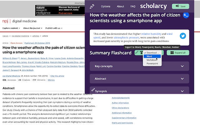 Bienvenido Scholarcy, su asistente digital para conquistar el vasto mar de artículos, informes y capítulos de libros. Con extracción automática de referencias, extensiones de Chrome y Edge, y una base de datos de tarjetas de resumen con capacidad de búsqueda, Scholarcy es su atajo para mantenerse al tanto de las últimas investigaciones.