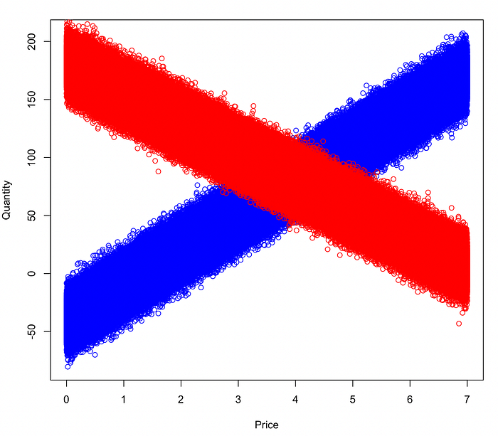 Primero, genero datos del sistema (1) usando los parámetros de nuestro juguete pero sin la condición S=D. El precio P se genera a partir de una distribución uniforme. Por lo tanto, tenemos dos ecuaciones de regresión que no están relacionadas excepto por la variable explicativa exógena común P. Genero 1 millón de puntos, creando la siguiente “batalla con sables de luz” entre las cantidades ofrecidas y demandadas: