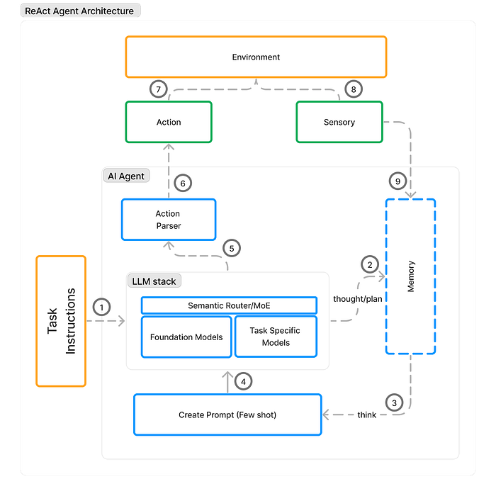 - Los pasos 5 a 8 permiten que LLM lleve a cabo interacciones externas, como extraer información según sea necesario para completar el pensamiento/tarea.
