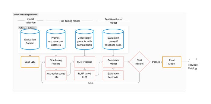 - Probar y evaluar modelo: la evaluación de modelos perfeccionados que funcionan con las complejidades del lenguaje natural depende de la creatividad de la tarea y la evaluación de la respuesta, que a menudo es manual y subjetiva. Si bien actualmente se dispone de diversas métricas y técnicas, a menudo no son suficientes ni justificables para evaluar un modelo. Se utilizan técnicas como una respuesta de otra referencia o modelo superior para generar conjuntos de datos de evaluación de referencia para ayudar a mejorar la eficiencia de la etapa de evaluación. Los modelos también deben probarse en cuanto a seguridad, sesgo y toxicidad.