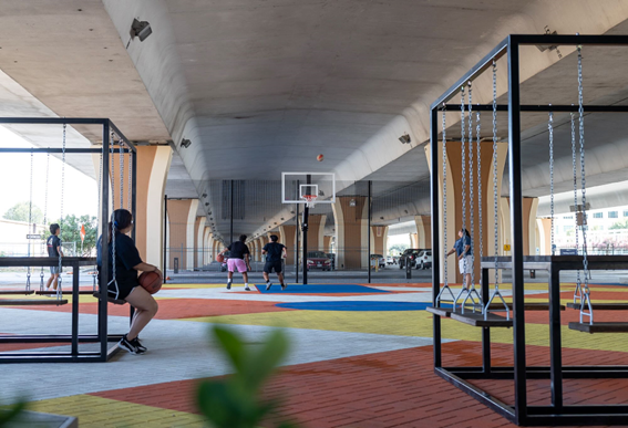 The Pass en San Antonio, Texas, es un paso subterráneo que se transformó en un vibrante tercer espacio para jóvenes, con comodidades sencillas como una cancha de baloncesto, estaciones de carga y asientos, gracias al apoyo de Claritin y la colaboración entre grupos comunitarios y el Proyecto para Espacios Públicos. Crédito: Bria Woods